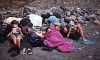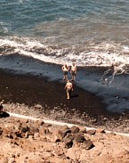 Mit Sonnenbaden und Kaffeetrinken im Strandcafé (die ham da wirklich Jazzkantine gespielt!) überbrückten wir das Warten auf den nächsten Bus mit dem Ziel Valle Gand Rey. Bereits nach wenigen Kilometern Fahrt - Berg hoch Berg runter ... - wünschen wir Hummi die Kretze an den Arsch, wie konnte er uns nur auf solch eine Insel schicken. Der Bus quälte sich noch ca. eine Stunde über die engen Passstrassen der Insel ehe wir Valle Grand Rey erreichten. Das Leeregefühl unserer Mägen treibt uns in den nä. Supermercodo (war wohl eher ein Mercadillo!), wo wir Dosenfisch in Tomaten Soße, subbidubbi leckere süße Bananen und Schinken-Käse-Baguettes (die uns noch die nä. sieben Tage als Tagesmenü verfolgen) erwarben um sie am hiesigen Nudistenstrand - Playa de Ingles, unsere erste Schlafstätte - zu vernaschen. Außer von Kili, der zum ersten Mal seine 0,5 mm "dicke" Isomatte verfluchte, und der über uns wachenden Lachmöwe wurde der Schlaf von niemand gestört