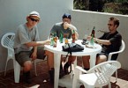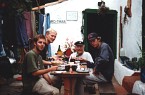 Nachdem Flo nach zwei Tagen endlich bemerkte, dass er wohl seinen heißgeliebten weißen Sonnenhut with deep and light blue stripes im Restaurant liegen gelassen hatte, machte er sich mit Uli auf den Weg ins Dorf, jedoch ohne Erfolg. Die lange Strecke sollte sich aber bezahlt machen, denn in einem Mercadillo fand man Stangenweise Krügerzigaretten zum Preis von 700 Pts. die Stange. Der Nikotinbedarf der nä. Tage war gesichert. (Falls jemand vom Uli oder Flo a Karten bekommen hat, wurde die mit Sicherheit während dieser Stunden in einer kleinen Bar verfasst.) Auf dem Rückweg trafen wir die auf der Insel häufig Sich-selbstsuchenden-Sozpäd-Studis. Nach kurzem Blablabla kamen wir auf das lästige Kommunikationsproblem auf der Insel zu sprechen und mussten mit Bedauern feststellen, doch nur Schüler des Lehrer Asts aus der Baumschule von nebenan zu sein: "Mit ein bisschen Latein- und Französischkenntnissen ist das mit dem Spanischen kein Problem, wie z.B. oben am Wegesrand das Schild "parque botanique" schnell auf einen botanischen Garten schließen lässt... (ohne Worte)". Den Rest vom Tag verbringen wir mit Schafkopfen und Backgammon an der Bude des neugewonnenen Freundes Ramon, der sich schon ersten Expansionsgedanken hingab.