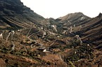 Nach dem Frühstück in der Vallehermosso-Bar, dem ersten Stützbier und zur Abwechslung mal Schinken-Käse-Baguette beobachteten wir die einheimische Autofahrerfrühschoppen- kultur: Fahrzeug mit laufendem Motor vor der Bar stehen lassen - Schnaps pressen - und mit 0,8 Promille weiterfahren. Ein altrömischer in französischer Sprache ausgeschilderter botanischer Garten mit spanischem Flair diente uns als erste Wegmarkierung der Tagestour. Hierauf folgte eine querfeldein Hardcore-Klettertour nach Marschzahl mit Cliffhangerreifen Klettereinlagen. Und als ob das noch nicht genug gewesen wäre, quälten wir uns noch eine schier endlose, grottenschief betonierte Treppe hinauf zur Siesta in der Pepsi-Bar (Lion-Riegel zum Mittagessen). Zwei Stunden später machten wir uns auf den Abstieg nach Agulo, wo Kili den heiligen Schwur fasste von seinen späteren Reichtümern einmal eine Fußgängerbrücke über das Tal zu bauen. Nach einer kurzen Rast in Las Rossas fraß Flo dem am Hungertuch nagenden Kili dessen Törtchen weg. Flo übernahm die Führung und schlug kurz vor dem Tagesziel nach links zu einer waghalsigen Tunnelumrundung ein. Der offizielle Fußweg wurde verpasst und dafür eine höherliegende Bewässungsleitung zur neuen "tiefschwarzen Piste direktly to Agulo" erklärt. Nach einstündigem Drahtseilakt am 400m tiefen Abgrund genossen wir den Blick durch den 150m langen Tunnel und bevorzugten von nun an die sichere Strasse. Agulo - eine 800 Seelengemeinde mit wunderschönem Friedhof, runder moscheenähnlicher Ermitta, dem wohl best sortierten Supermarkt Gomeras (Einkauf auf Marmorboden !) und dem unauffindbaren Dorftreff mit subbi dubbi lecker Essen - der Bar Pepe. Die gespannte Stimmung und der Hunger trieb uns in die Bar des deutschen Golfos (golfo (span.) = Nepper, Schlepper, Bauernfänger) Brettermann, eigentlich hieß er ja Bertermann, zur Tapas- und Sauforgie, die sich auch postwendend im Geldbeutel bemerkbar machte. Der anschließende Blindflug bescherte uns einen Schlafplatz in einer Bananenplantage. - Kleiner Tipp vom alten Pfadi Kili: "Frische, junge Bananenblätter verbessern den Liegekomfort einer 5mm dicken Isomatte !" -