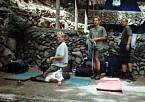 9 Uhr morgens: Der sonntägliche Kirchgang entfiel. Für Hein eine Aspirin (Heineken) und für uns ein Stützbier. Nachdem wir Mieze und Charly kenngelernt hatten, trieb uns Hein zum Wasserholen an einer kurzgeschlossenen Leitung ca. 150 m tiefer. Mit Fronarbeit verdienten wir uns das erste richtige Frühstück (Rührei, Marmelade, Schwarzbrot und Kaffee). Kurz entschlossen nahmen wir Heins Angebot, noch eine weitere Nacht bei ihm zu verbringen, an und Animateur Hein erstellte im Gegenzug ein tolles Tagesprogramm: